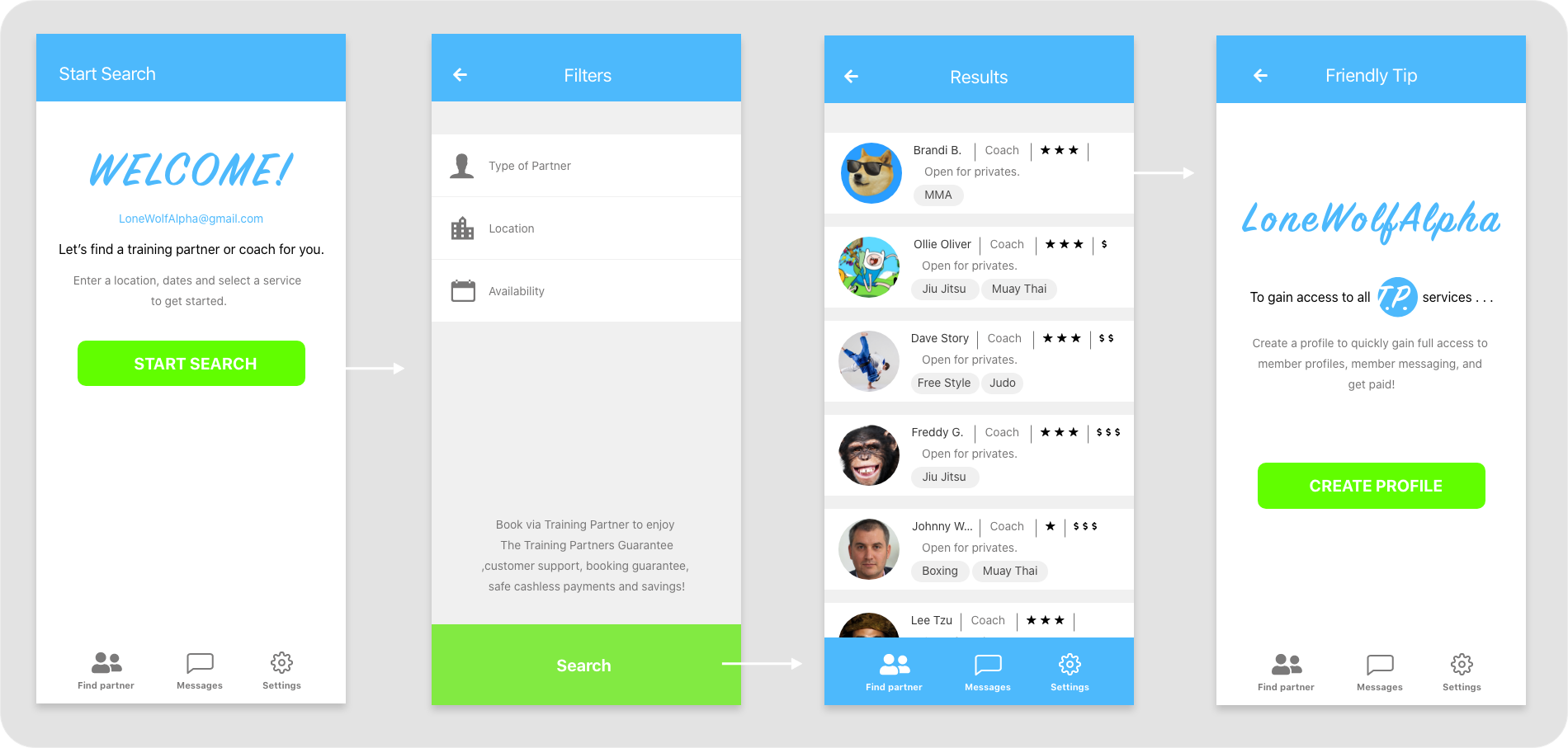 The Training Partners app was prototyped to connect various martial arts coaches, students, competitors and enthusiasts. It allows for users to search by 3 major categories ( participation category, location, and schedule ) which then breaks down into more subcategories. The app would create a niche community and promote cross gym and cross discipline training. It would streamline the ability to meet up with like minded and goal oriented individuals. The app would allow for service monetization with such options as coaching services. The best part is it would create a new economy and opportunity within the martial arts community by promoting the monetizing of drilling and sparring partners. This would reward hobbyists, amateurs and even professionals by providing an avenue of capital while improving themselves and other users. The app would have 2 different monthly subscriptions. One for normal users who don't want to monetize and the other for paid services.
